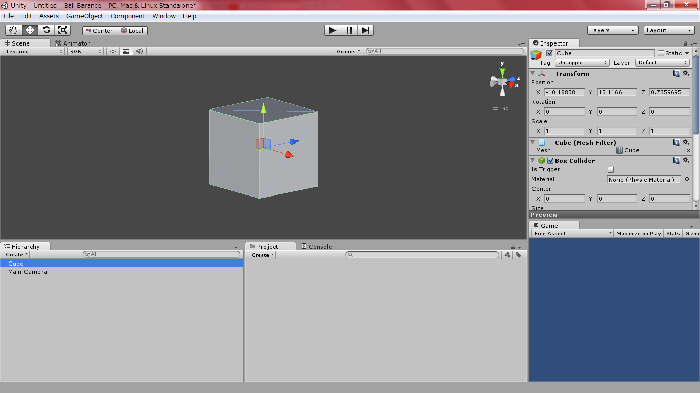 ちなみにGame画面を見ていただくと、画面中央にCubeが出てくると思います。