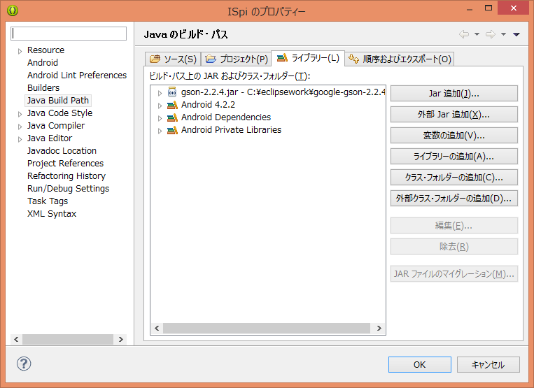 次にEclipseを起動したらGsonを使おうと思うプロジェクトの「ビルドパスの構成」を行います。